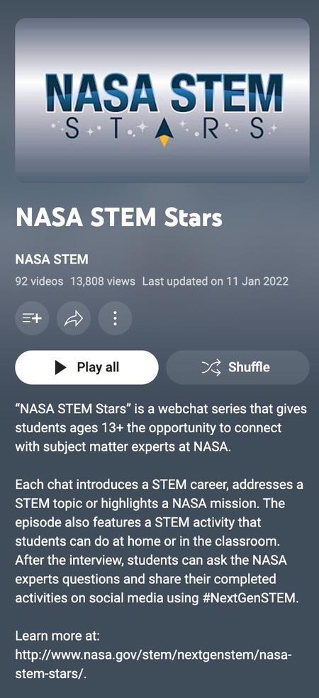 “NASA STEM Stars” is a webchat series that gives students ages 13+ the opportunity to connect with subject matter experts at NASA.